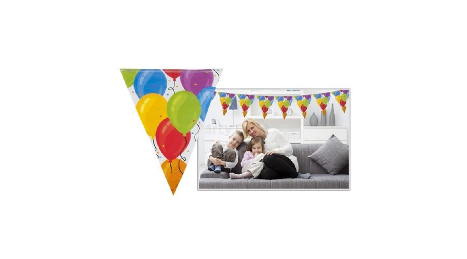 Születésnapi, névnapi, vagy egy vidám kerti parti dekorációs eleme lehet ez a színes, lufis zászló. Egészítsd ki hozzá illő tányér, pohár, szalvéta együttesével A termék 11 db mintás zászlóból áll és 3,6 méter hosszú.