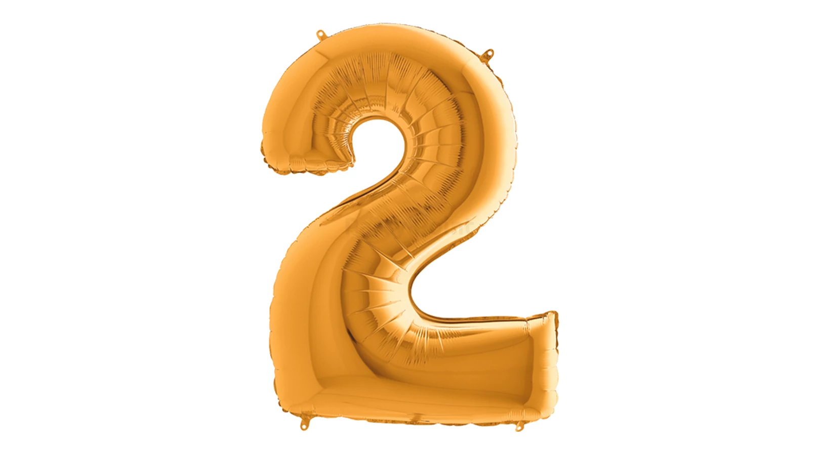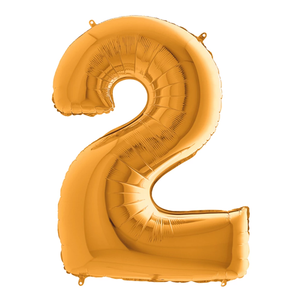 Csomagolt, 100 cm-es arany színű 2-es szám fólia lufi. A lufi héliummal és levegővel is tölthető, önzáró szeleppel műkődik.