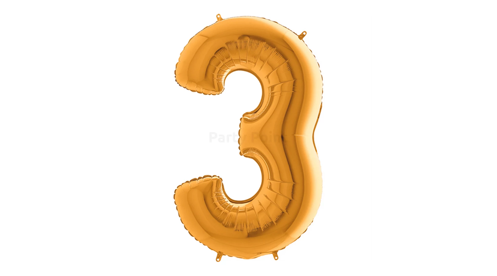 Csomagolt,100 cm-es arany színű 3-as szám fólia lufi . A lufi héliummal és levegővel is tölthető, önzáró szeleppel műkődik.