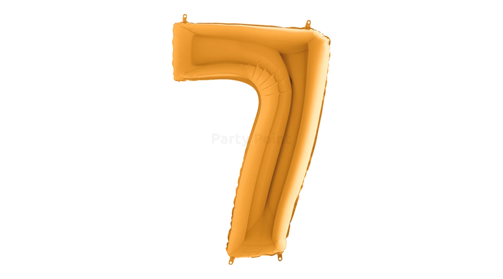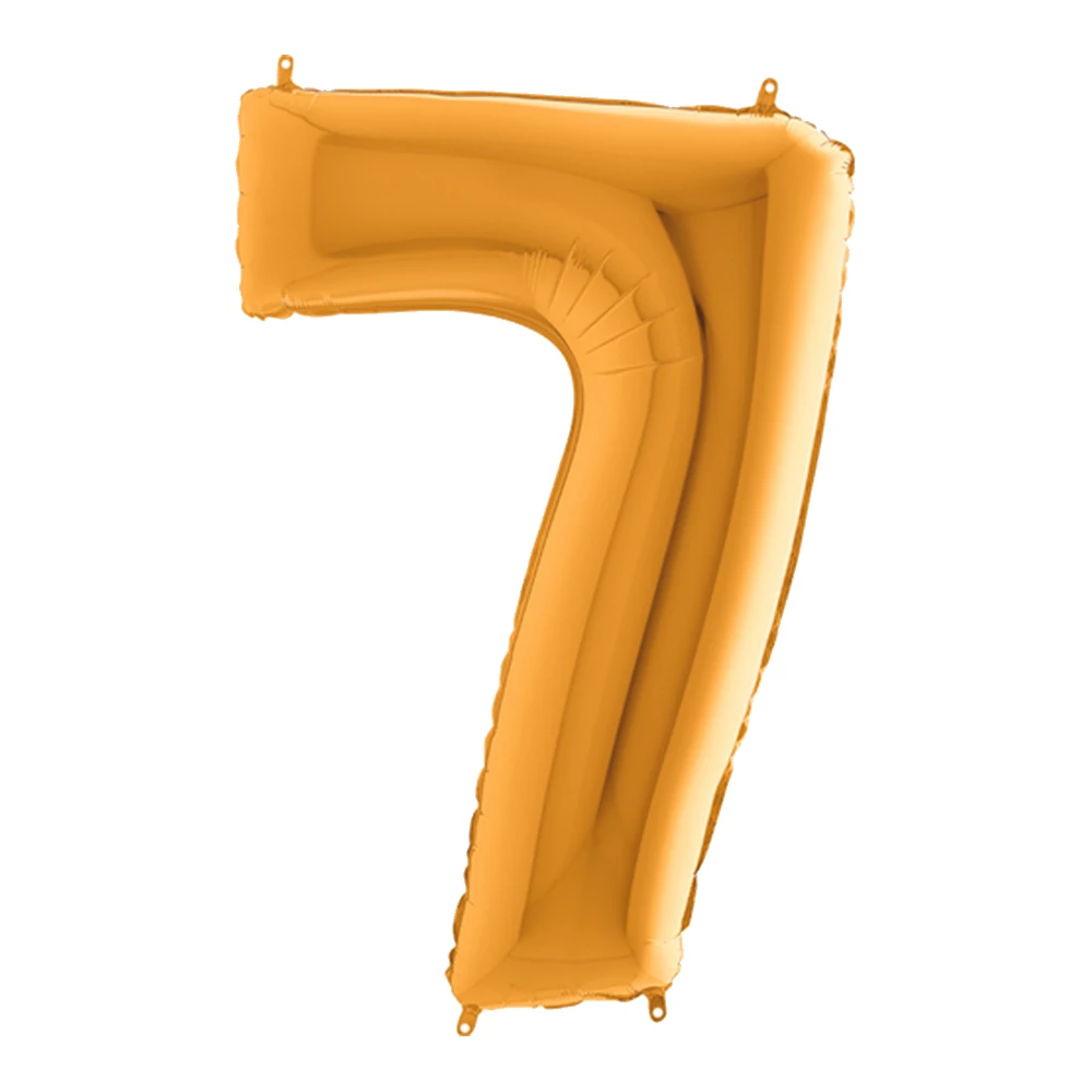 Csomagolt, 100 cm-es arany 7-es szám fólia lufi. A lufi héliummal és levegővel is tölthető, önzáró szeleppel műkődik.