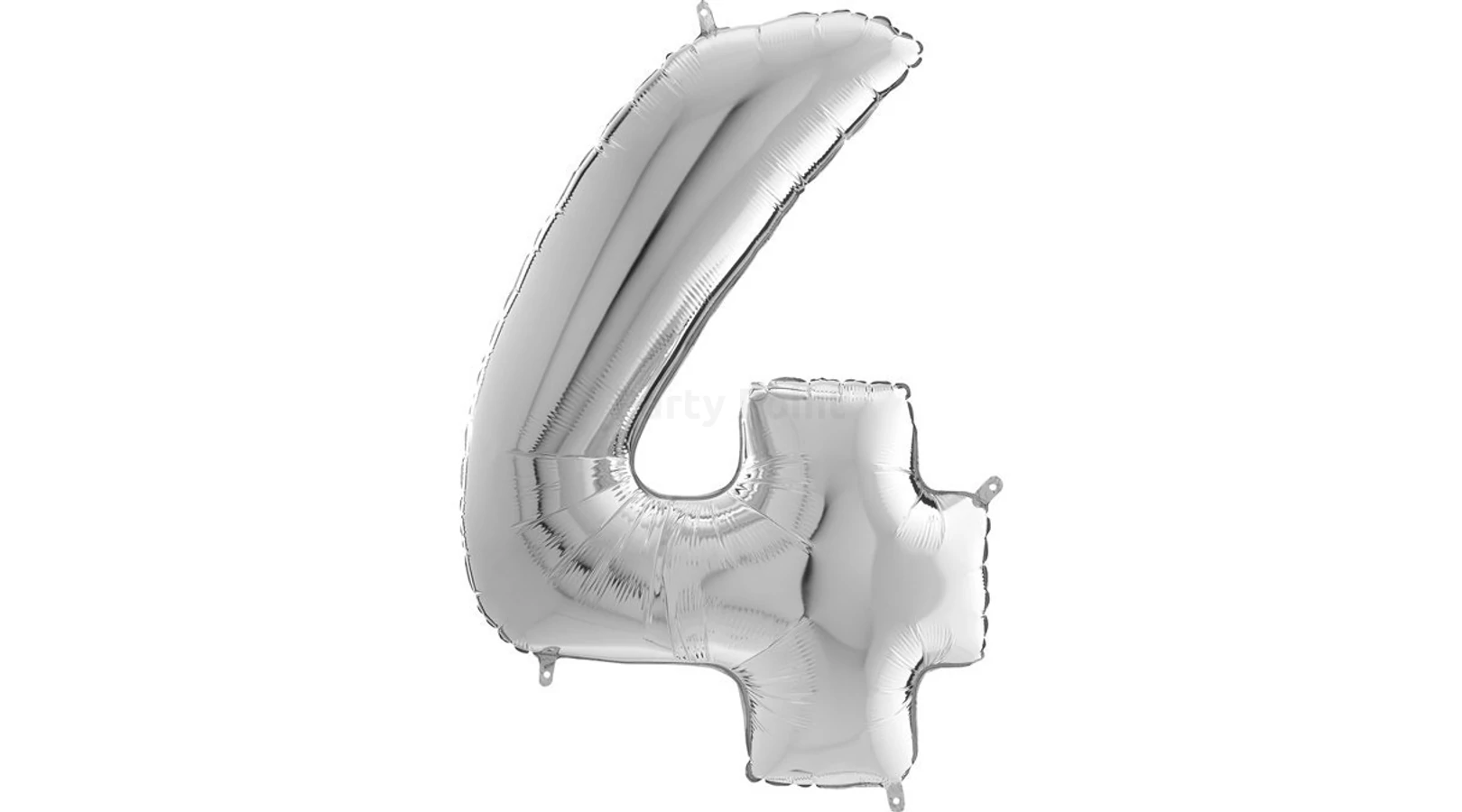 Csomagolt, 100 cm-es ezüst színű 4-es szám fólia lufi. A lufi héliummal és levegővel is tölthető, önzáró szeleppel műkődik.