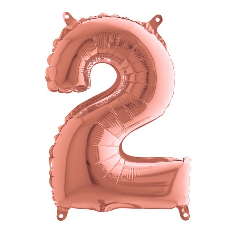 Csomagolt, 100 cm-es rosegold színű 2-es szám fólia lufi. A lufi héliummal és levegővel is tölthető, önzáró szeleppel műkődik.
