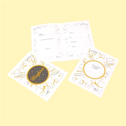 Elegáns stílusú születésnapi partihoz ajánljuk ezt a meghívót, amit kiegészíthetsz hozzá illő terítékkel, fólia lufival. Kombináld fekete, fehér, ezüst és arany légömbökkel.