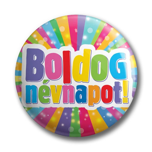 58 mm átmérőjű kitűző, Boldog névnapot felirattal.