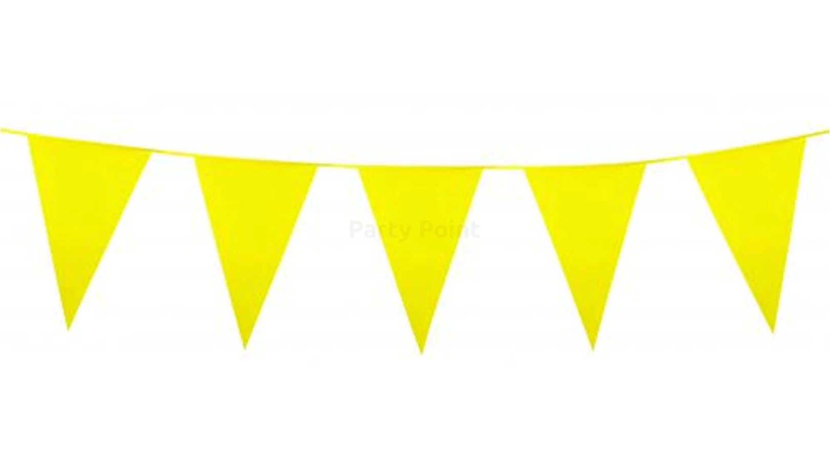 Bármilyen rendezvényen, partin, házibulin, de akár szilveszterkor is jól mutat ez a sárga, háromszög formájú elemekből álló, műanyag zászló. A zászló 10 méter hosszú és 46x30 cm-es elemekből áll. Egészítsd ki hozzá illő léggömbökkel, girlandokkal, feliratokkal is.
