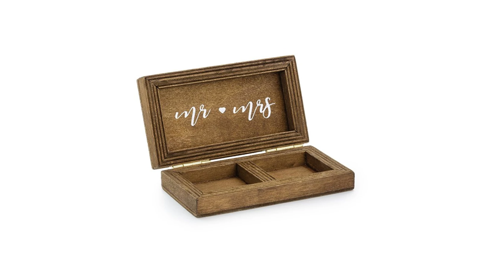 Ez a fából készült dobozka fehér felirattal kívül-belül, kiváló választás a nagy napra, ha egy igazán egyedi dologra vágysz az oltár előtt.