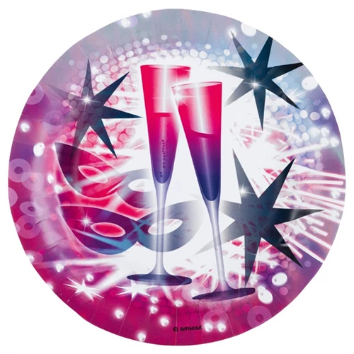 Pezsgőspoharas, Happy New Year papírtányér, 23 cm -es, 8 db/cs. Minden fergeteges szilveszteri party elengedhetetlen kelléke a papírtányér. Egészítsd ki hozzá illő pohárral és szalvétával és dobd fel a hangulatot!