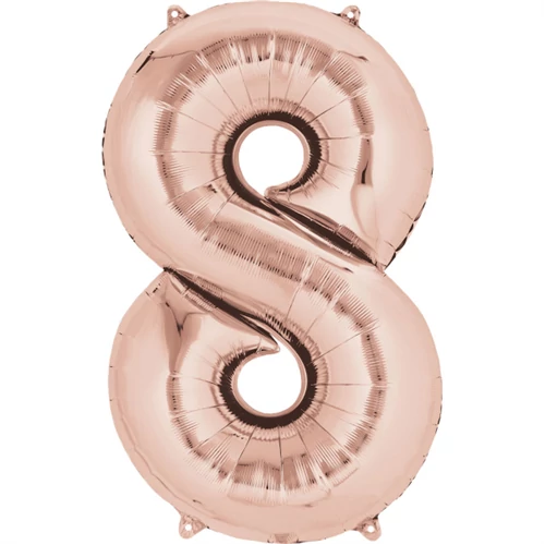 86 cm-es rose gold szám fólia lufi. Kiváló ajándék és dekoráció ez az impresszív, szám alakú lufi, elegáns, rose gold színben. Válassz mellé másik, szám alakú lufit, és rakd ki a kívánt évszámot! A dekorációt kiegészítheted alkalomhoz illő gumi lufikkal, feliratokkal vagy girlandokkal. Héliummal és levegővel is tölthető.