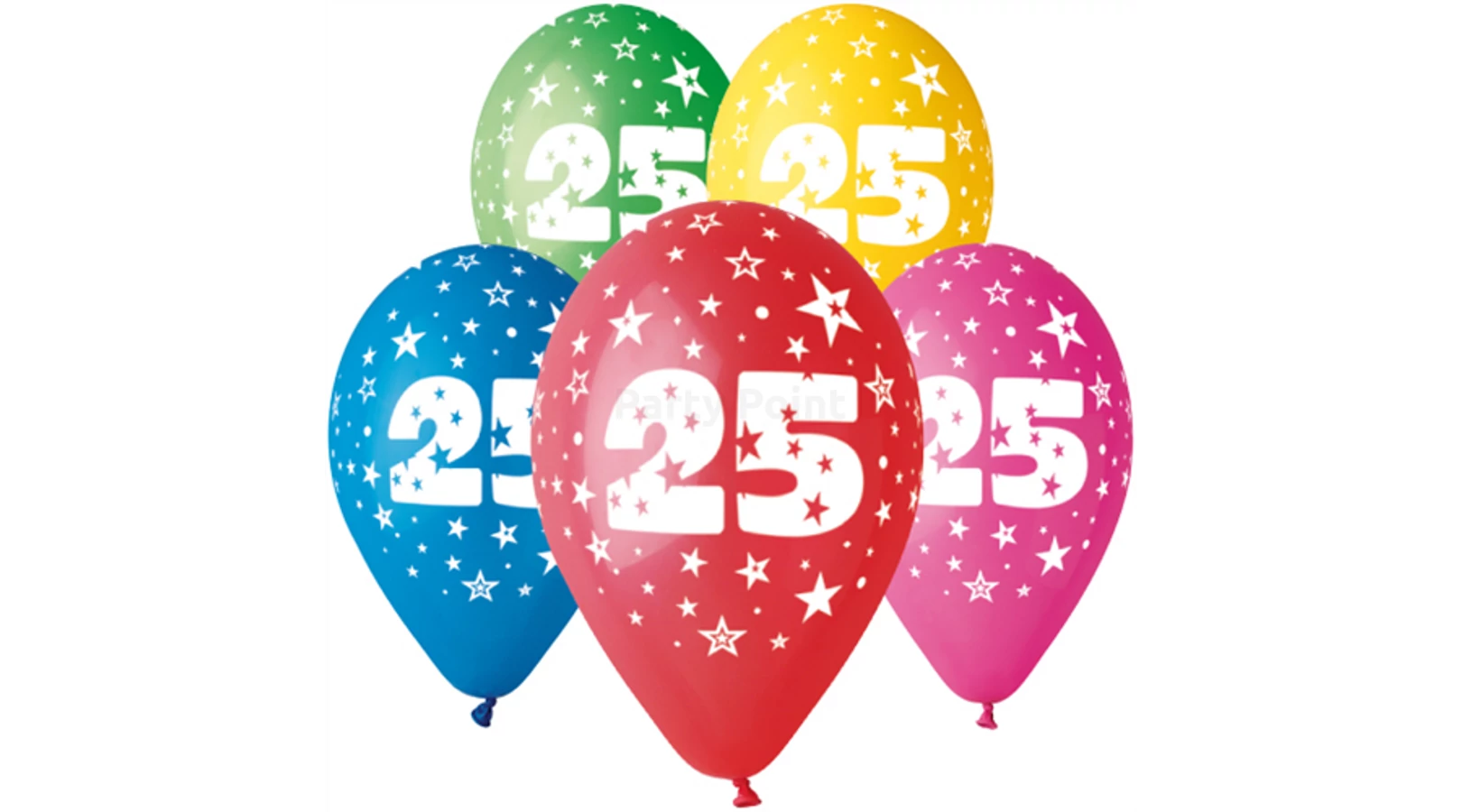 Számos gumi lufi 25, 5 db/cs. A 25. születésnap igazán különleges alkalom! Dobd fel a party dekorációt ezzel a vidám, színes gumi lufival. Kiegészítésként választhatsz mellé számozott zászlókat vagy alkalomhoz illő feliratot. Héliummal és levegővel is tölthető.