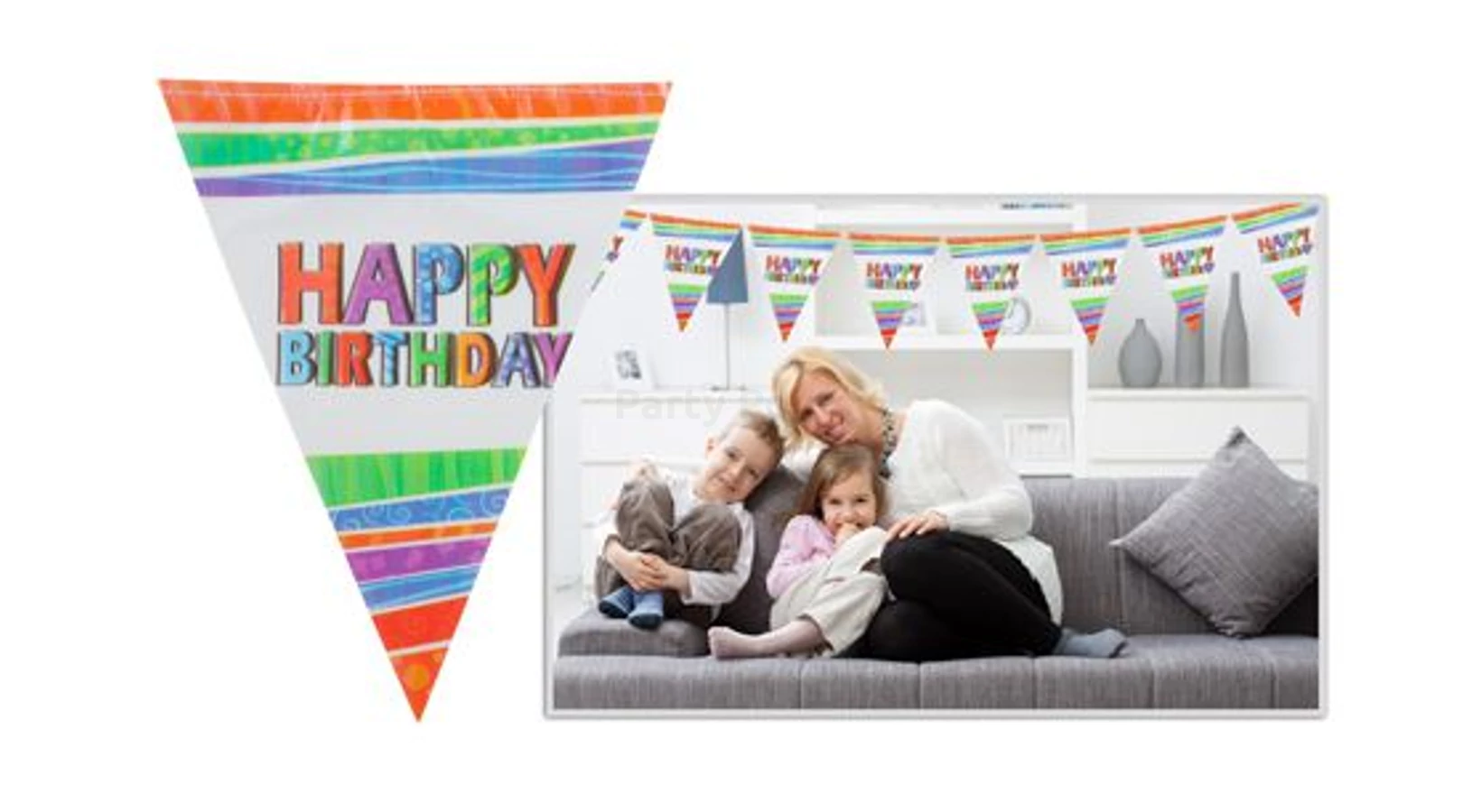 A szülinapi buli helyszínét dekoráld ezzel a színes csíkos, Happy Birthday feliratos zászlóval. A zászló 3,6 méter hosszú.