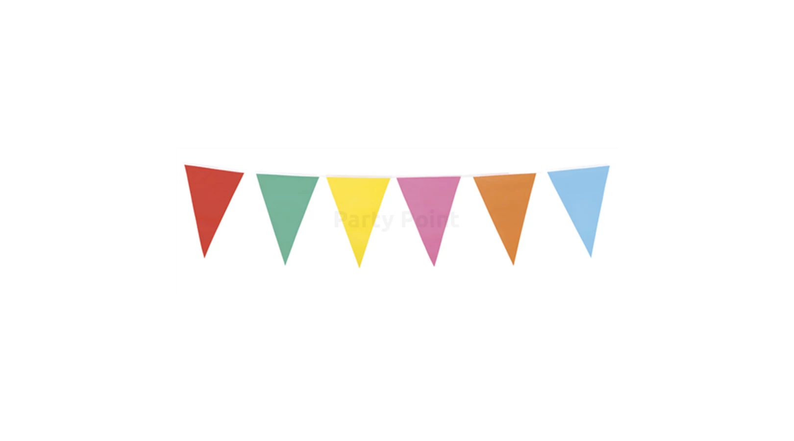 Bármilyen rendezvényen, partin, házibulin, de akár szilveszterkor is jól mutat ez a színes, háromszög formájú elemekből álló, műanyag zászló. A zászló 10 méter hosszú. Egészítsd ki hozzá illő léggömbökkel, girlandokkal, feliratokkal is.