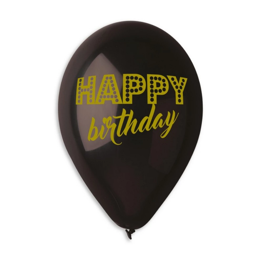 30 cm-es fekete HB arany nyomattal gumi lufi 10 db/cs. Dobd fel a születésnapi party dekorációt ezzel a különleges, arannyal nyomott gumi lufival. Kiegészítésként választhatsz mellé számozott zászlókat vagy alkalomhoz illő feliratot. Héliummal és levegővel is tölthető.