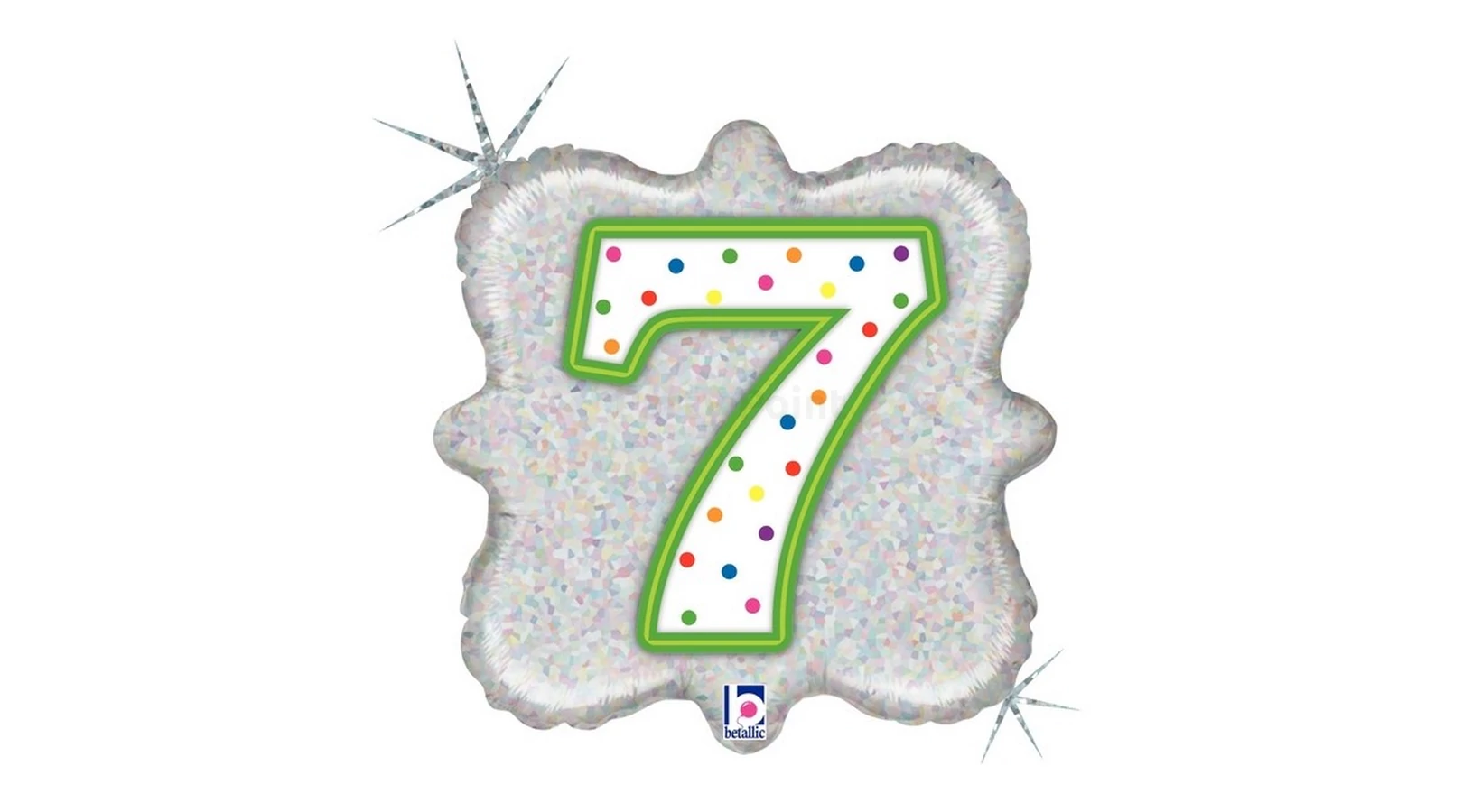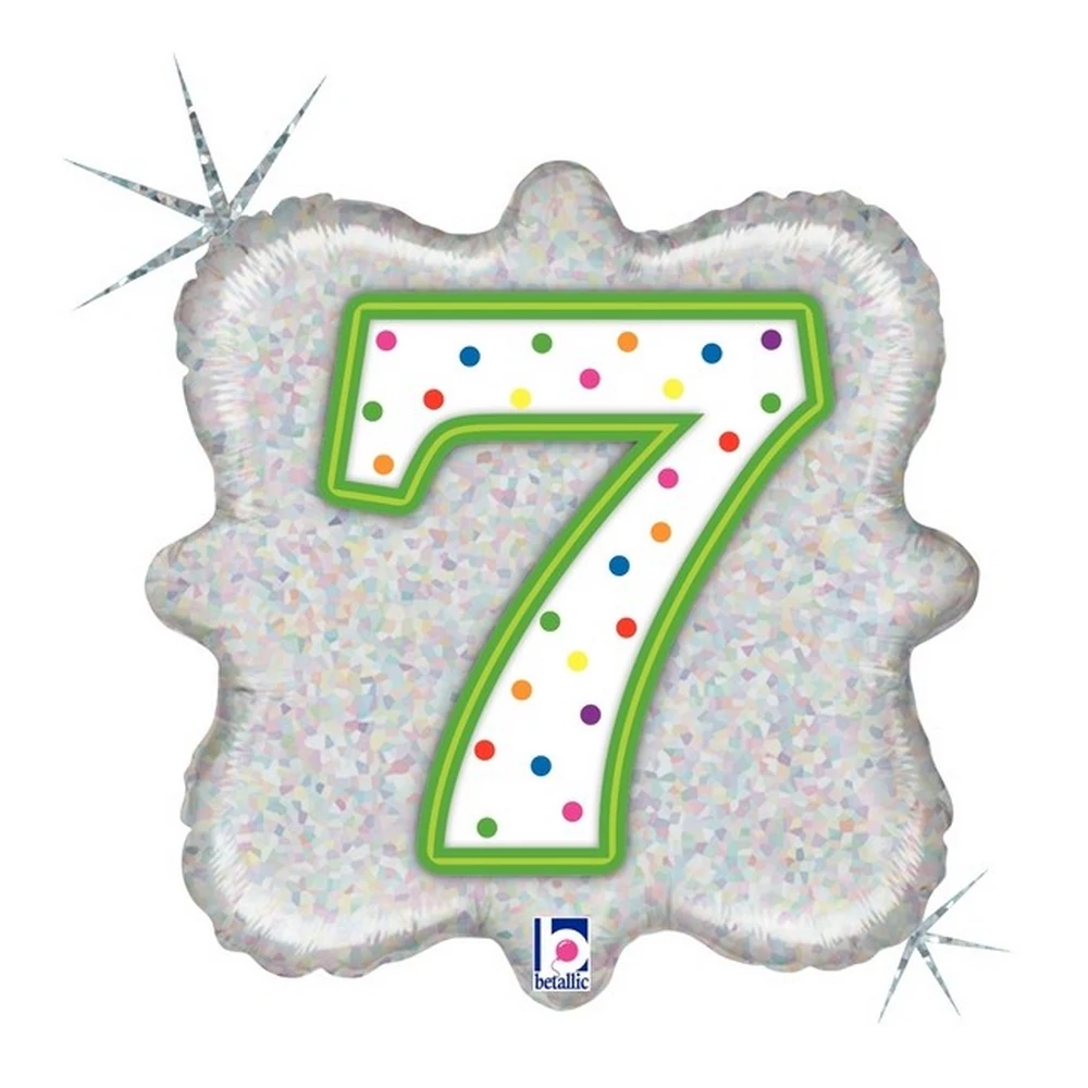 Csomagolt,45 cm-es Hologrammos 7-es gyertya fólia lufi. A lufi levegővel és héliummal tölthető, önzáró szelepes.
