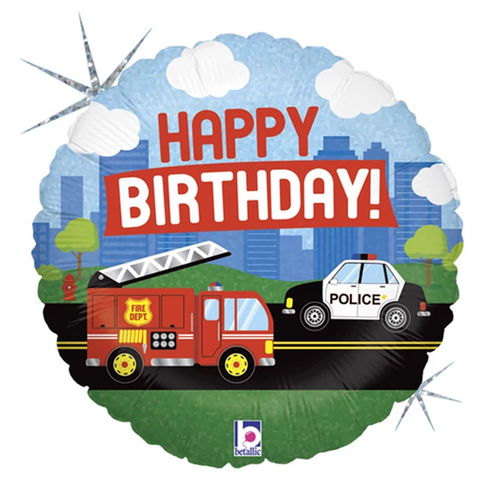 45 cm-es sűrgősségi járműves Happy Birthday hologramos fólia lufi. Ez a sürgősségi járművekkel díszített hologramos fólia lufi Happy Birthday! felirattal remek választás egy születésnapi party dekorációjához kisfiúknak, de ajándéknak is szuper. Mérete: 45 cm. Héliummal és levegővel is tölthető, önzáró szeleppel rendelkezik.