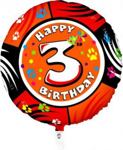 Harmadik szülinapra nagyszerű ajándék vagy dekoráció is lehet ez a kedves, számozott, állat mintásfólia léggömb. Önzáró szeleppel rendelkezik; héliummal és levegővel is tölthető. Mérete: 53 cm.