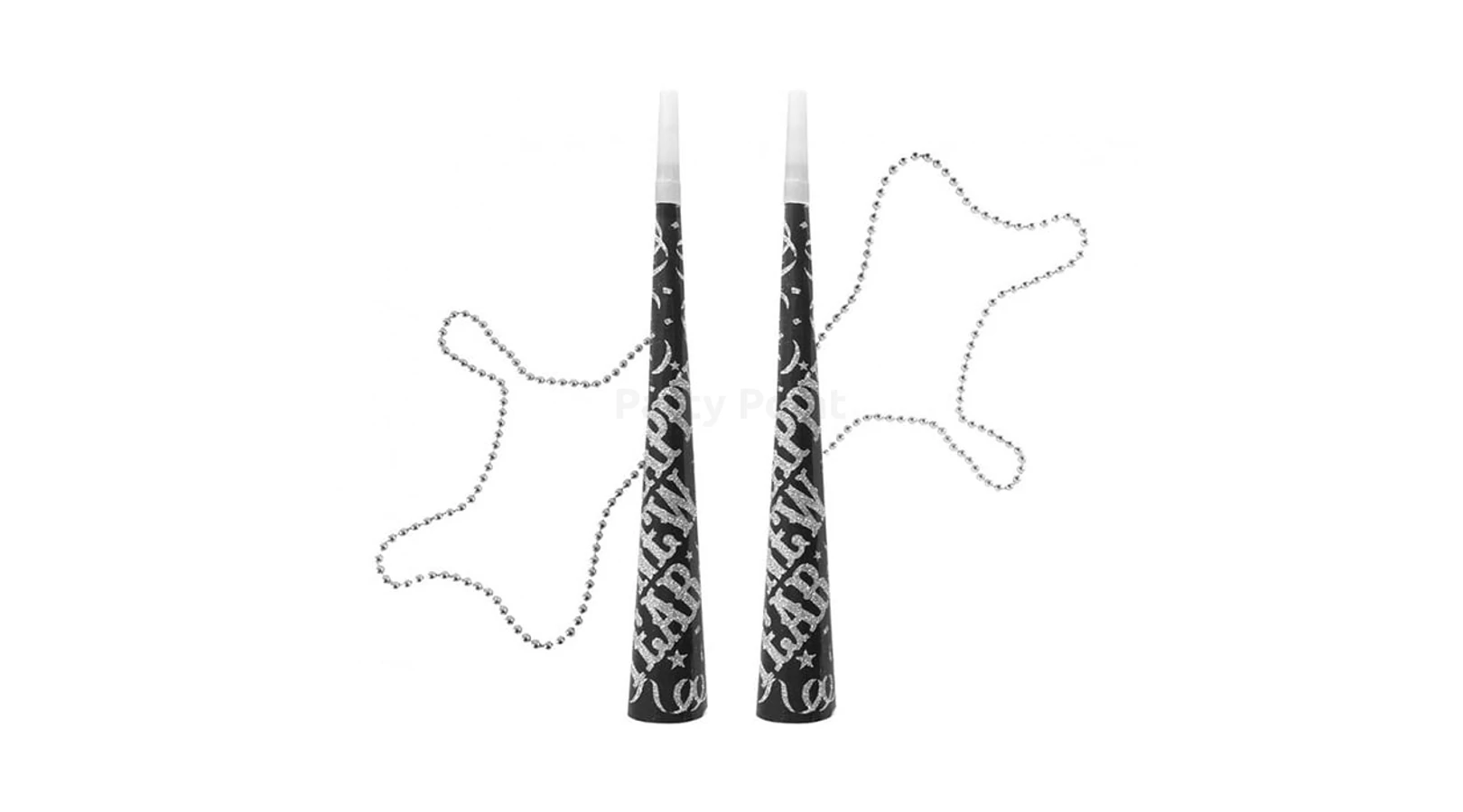 Trombita Happy New Year ezüst láncon, arany - 2 db / csomag. Nincs szilveszteri parti trombita nélkül! Amint éjfélt üt az óra, ünnepeld meg jó hangosan az új évet!