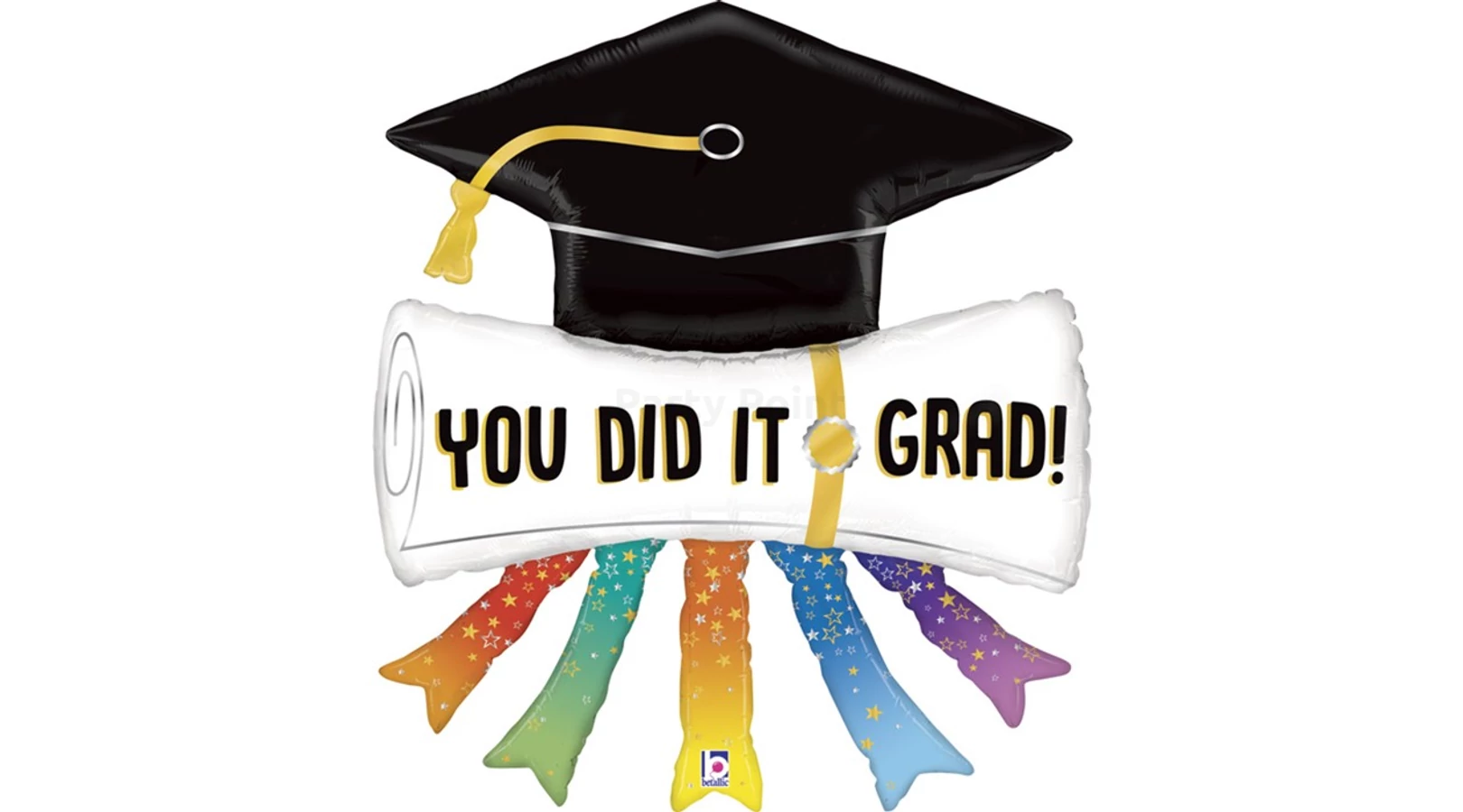 110 cm-es oklevél diploma kalapban You Did it Grad fólia lufi Ballagásra, diplomaosztóra szuper ajándék ez az kalapos okleveles, You did it grad feliratos fólia lufi. Levegővel és héliummal is fújható. Mérete: 110 cm.