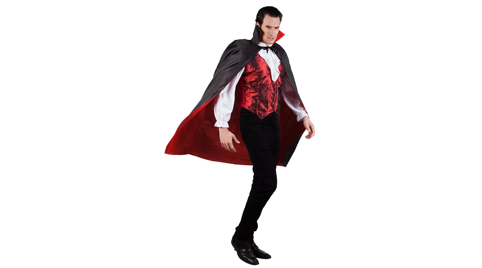 Fekete-piros kifordítható vámpírköpeny 120 cm. Lehet farsang vagy Halloween, ezzel a vámpírköpennyel garantált a siker egy beöltözős, jelmezes bulin. Kombináld jelmez kiegészítőinkkel.