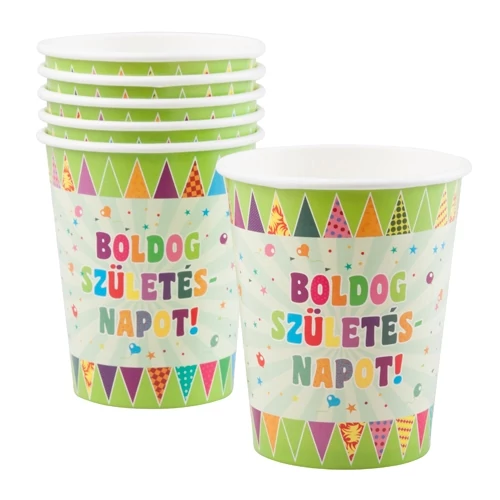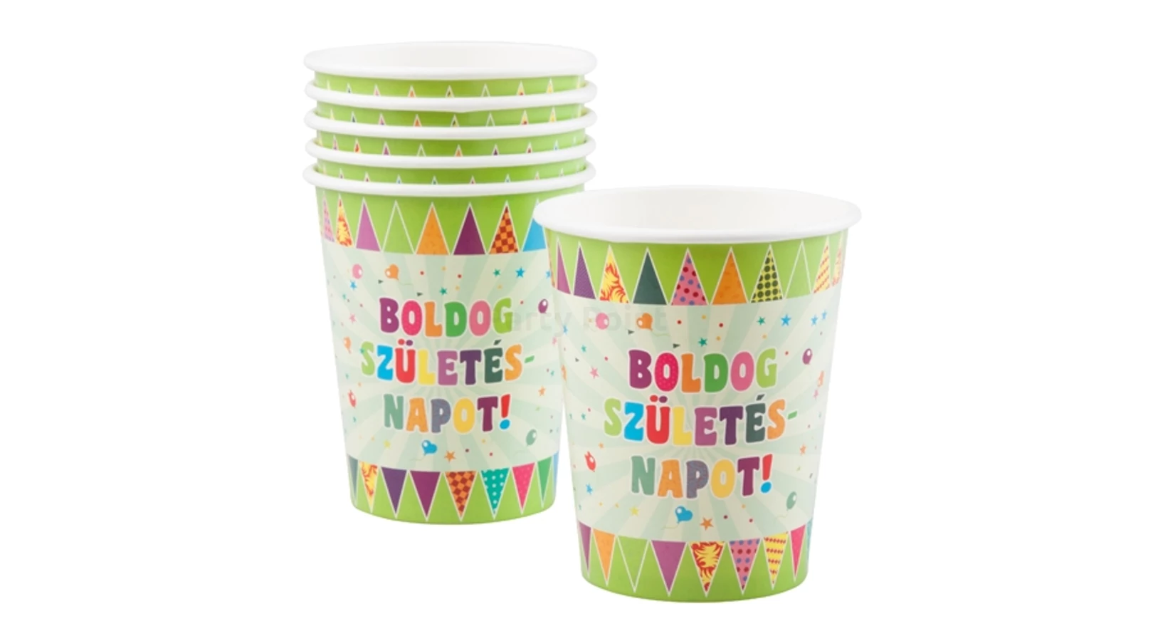 Ezzel a vidám Boldog Születésnapot feliratos pohárral feldobhatod az ünnepi asztal terítékét, főleg ha kiegészíted a hozzá illő tányérral és szalvétával is. A parti helyiség díszítéséhez használhatsz gumi vagy fólia léggömböket is. Mérete: 250 ml. A csomag tartalma: 6 db.
