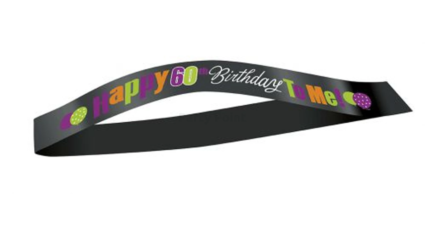 Ha Te vagy ma a szülinapos ünnepelt, ráadásul a 60. szülinapod van, akkor viseld magadon ezt a fekete alapon, színes, Happy 60. Birthday to me feliratos vállszalagot.