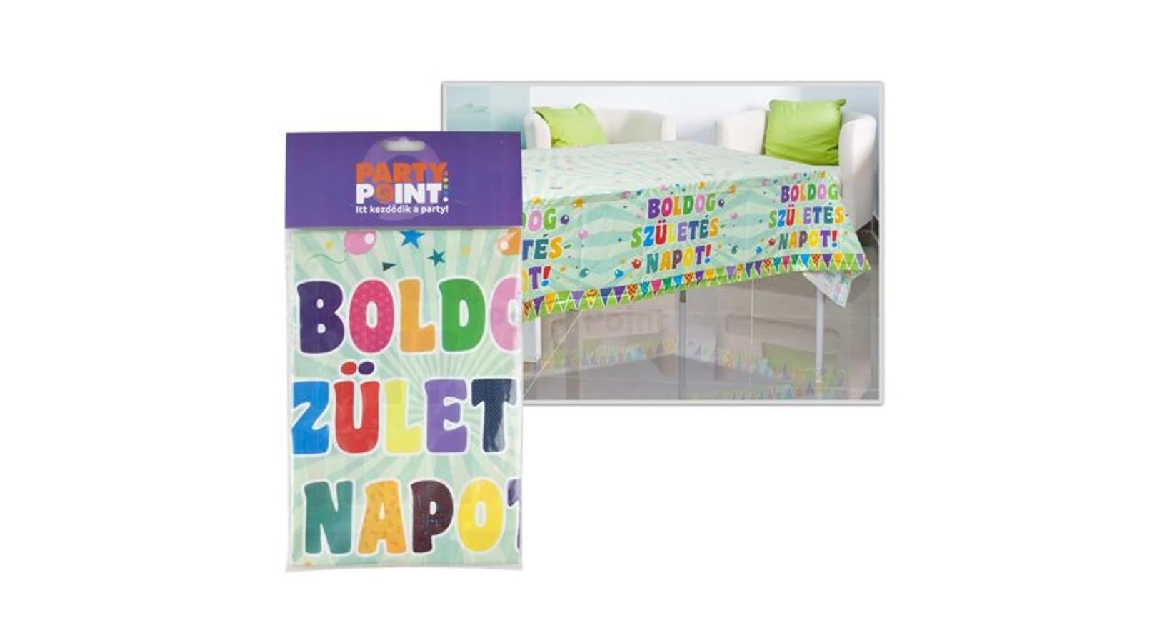 Zászlós Boldog Születésnapot asztalterítő, mérete: 130x180 cm. Feldobnád a születésnapi party dekorációt? Válaszd ezt a vidám, "Happy Birthday" feliratú asztalterítőt. A teljes összhang érdekében, egészítsd ki a terítéket, hozzá illő party tányérral, pohárral és szalvétával is.